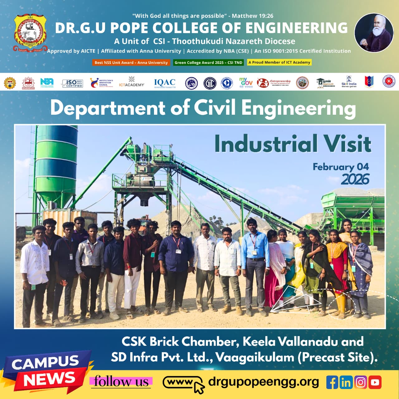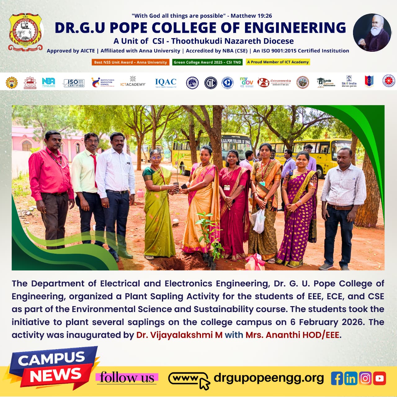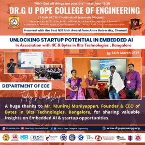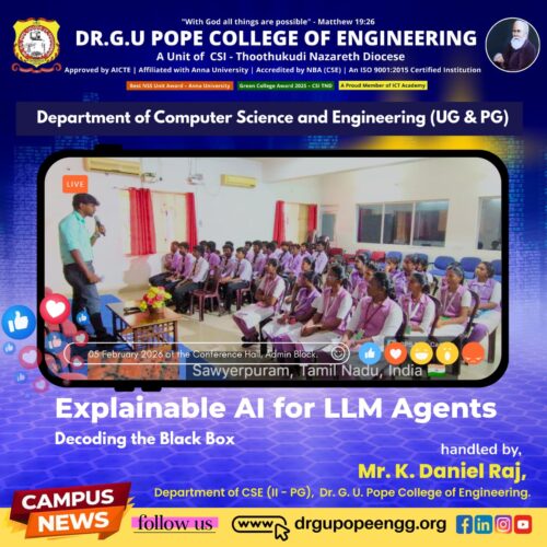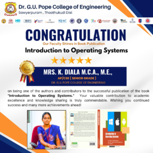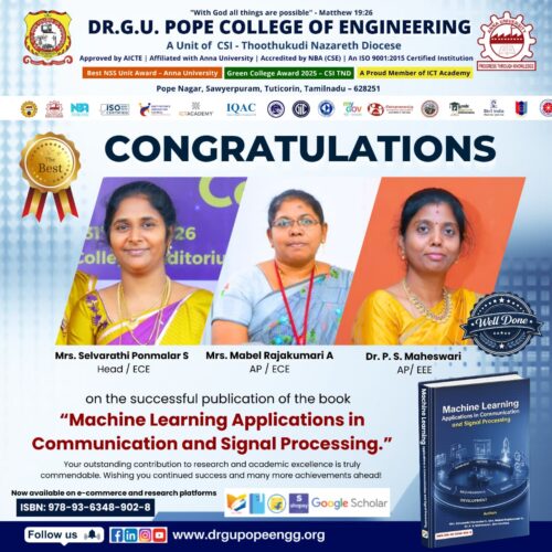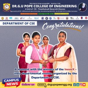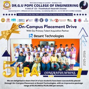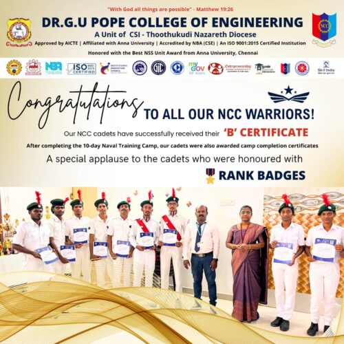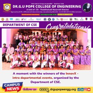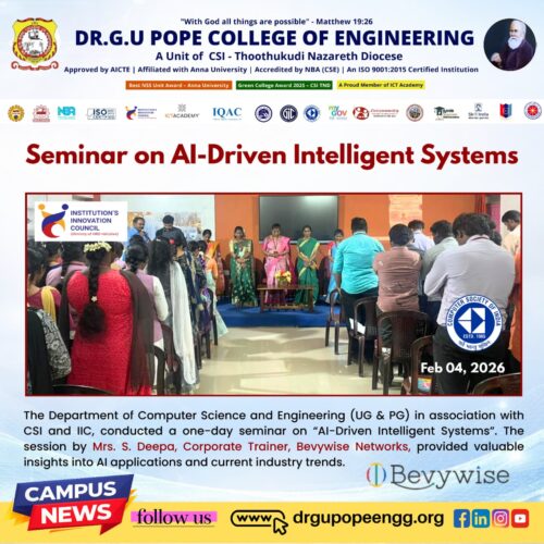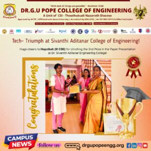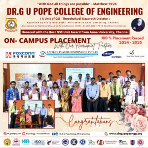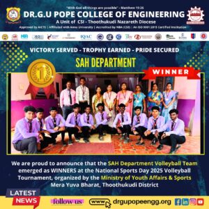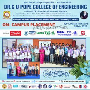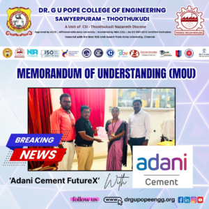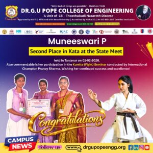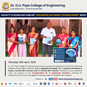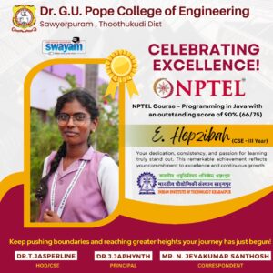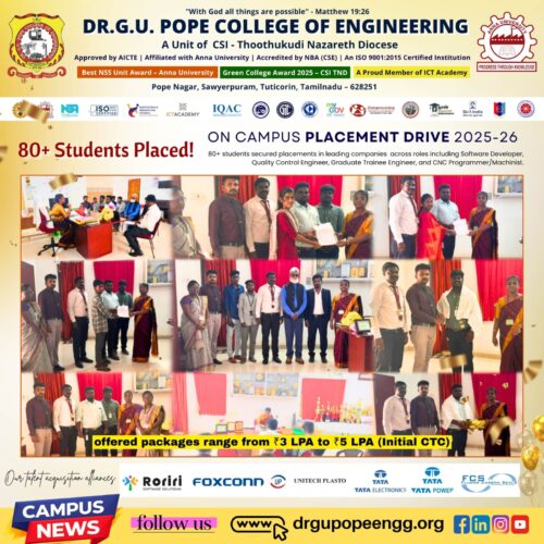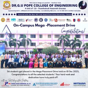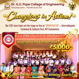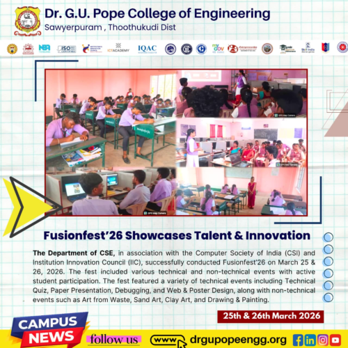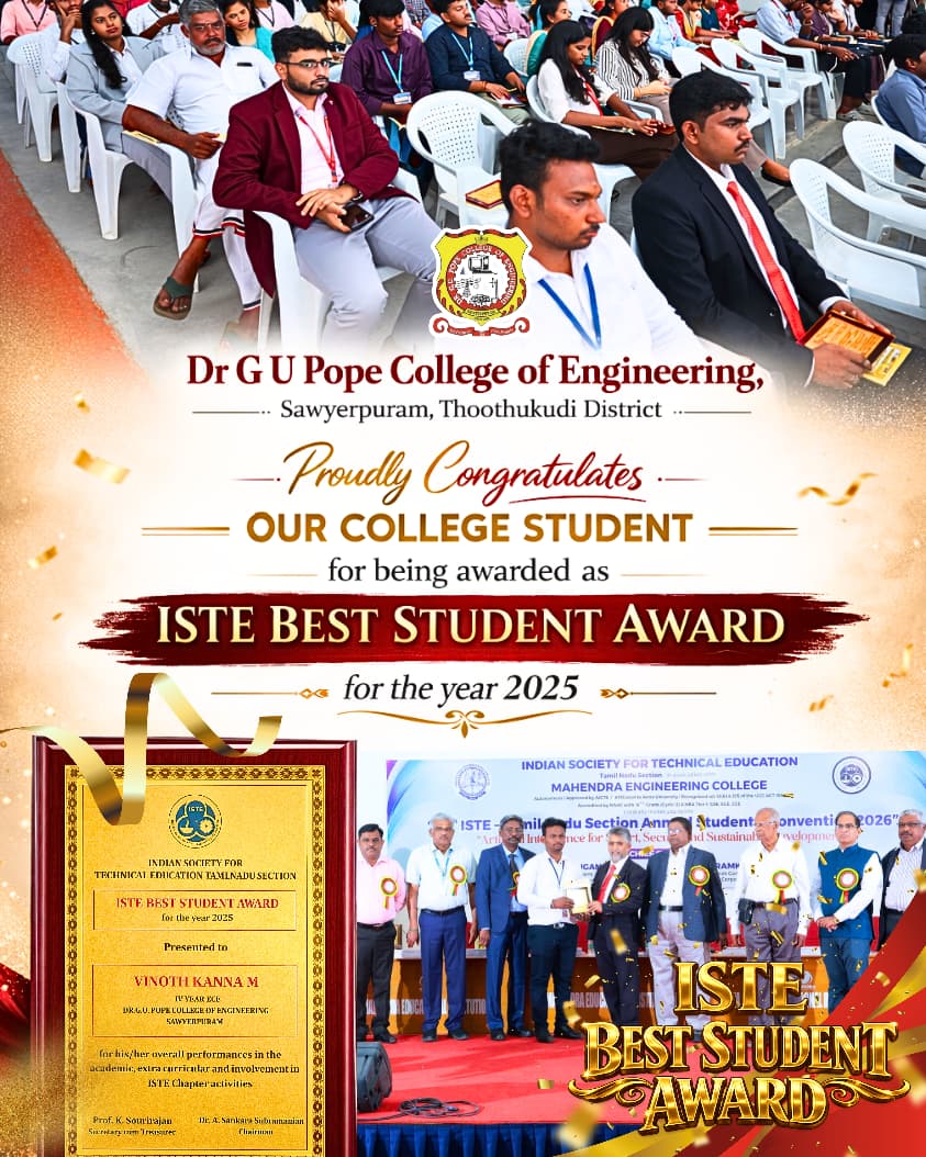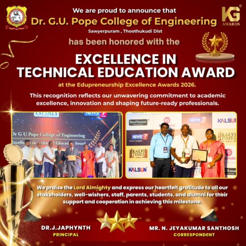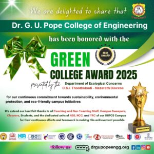 Dr. G.U. Pope College of Engineering stands as the fulfillment of the earnest aspirations of Sawyerpuram’s well-wishers, who longed for the accessibility of technical education in their vicinity. Commencing its service to the Sawyerpuram community in the academic year 2002-2003, the college operates under the auspices of the CSI Thoothukudi-Nazareth Diocese. This institution was established by devoted and sincere missionaries committed to delivering quality and disciplined education to remote areas.