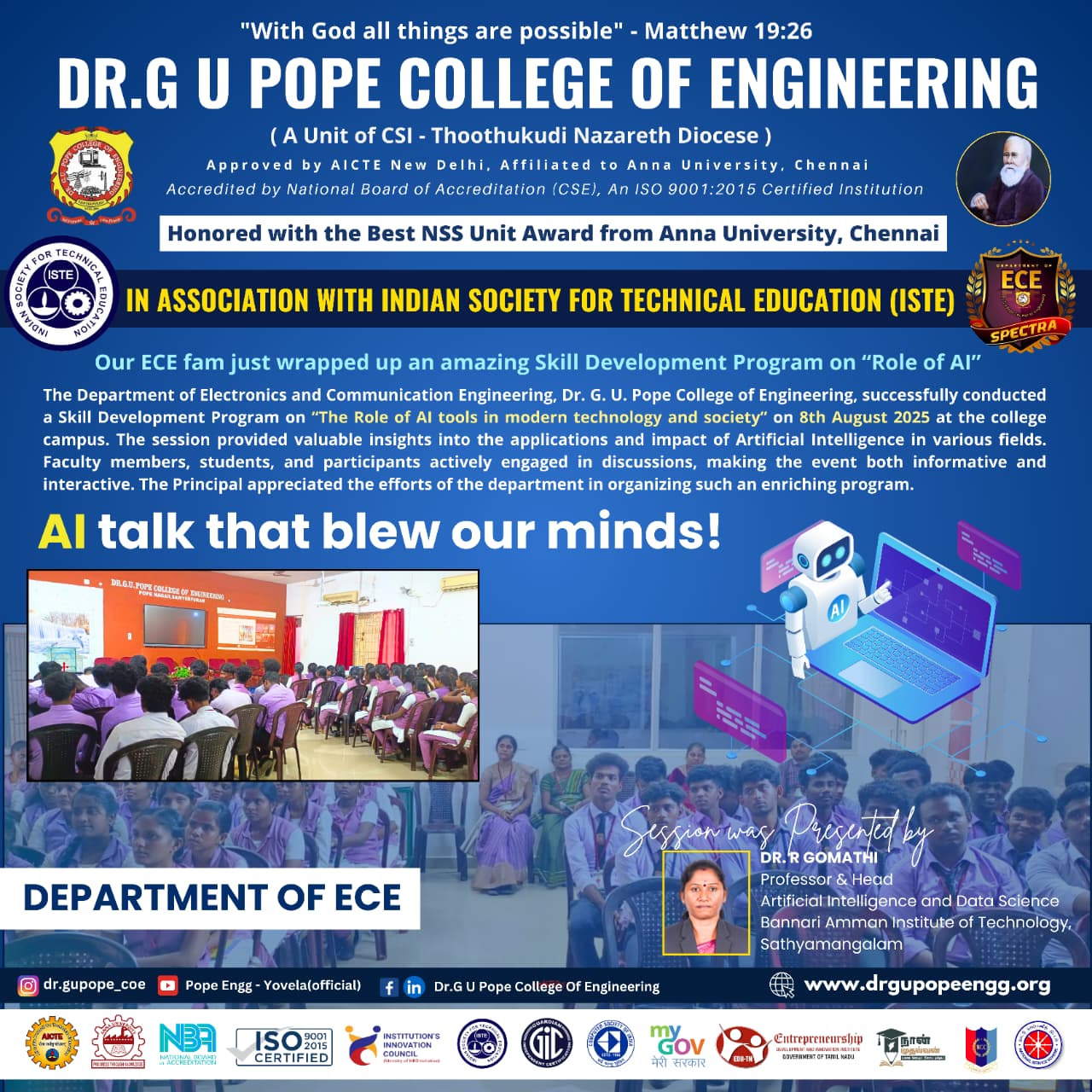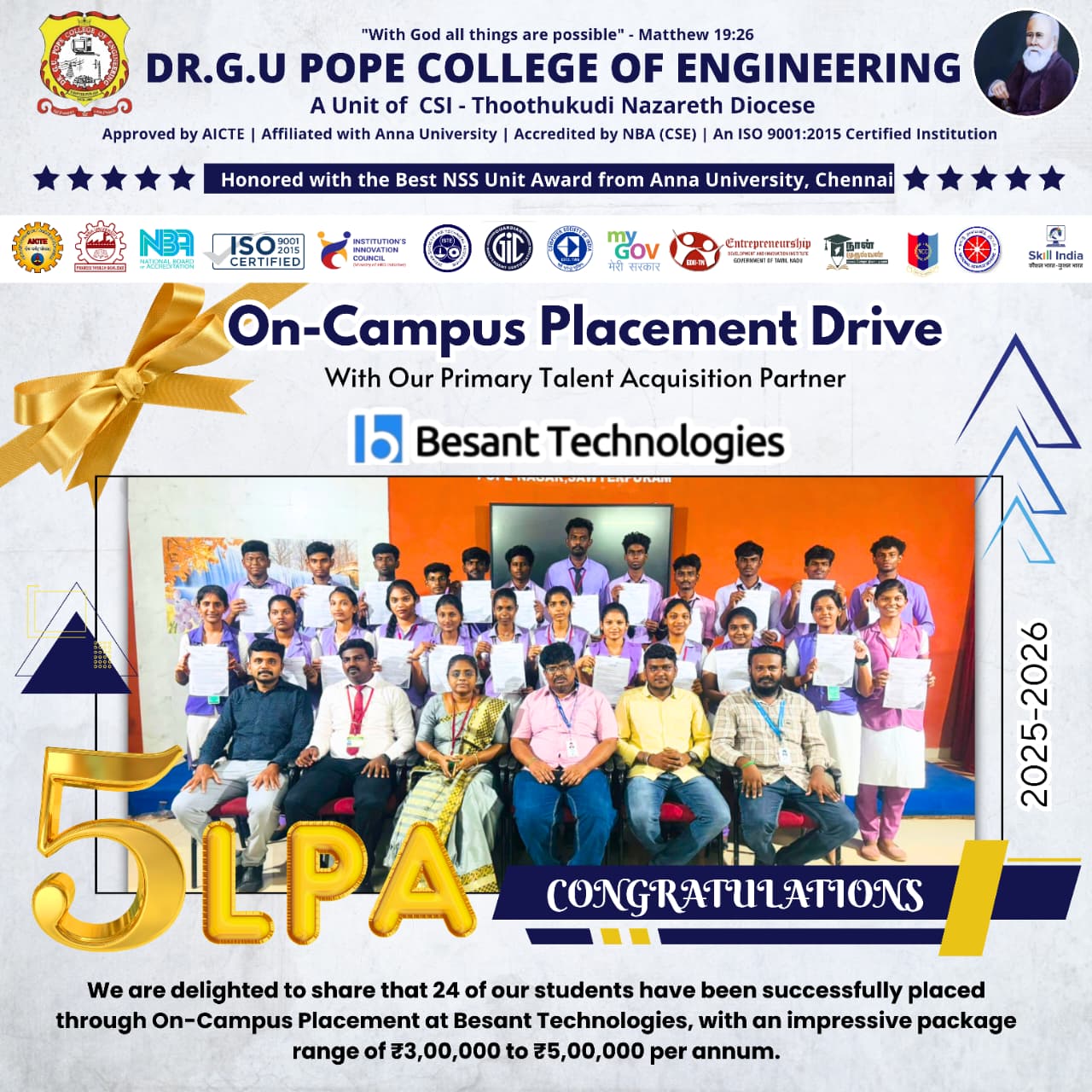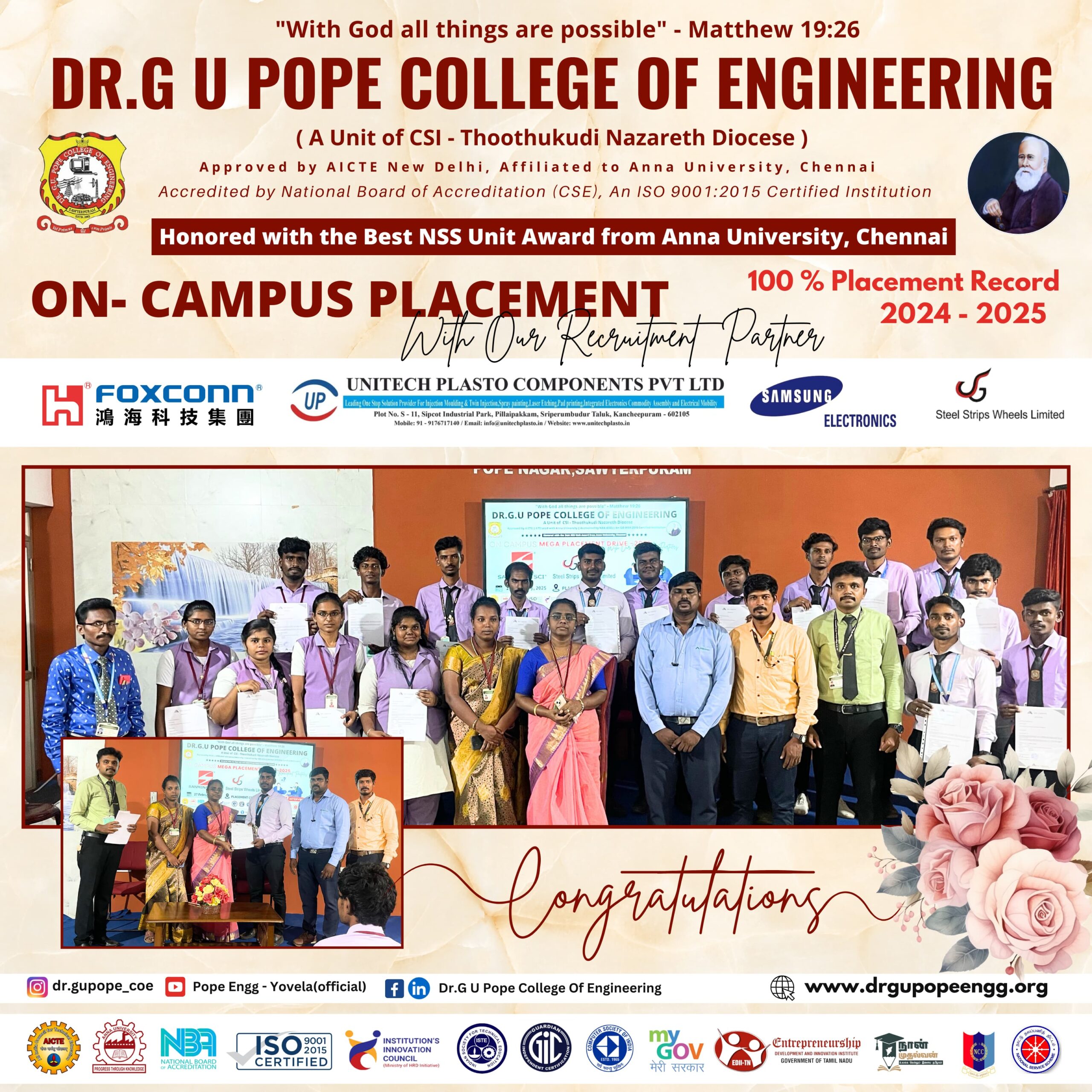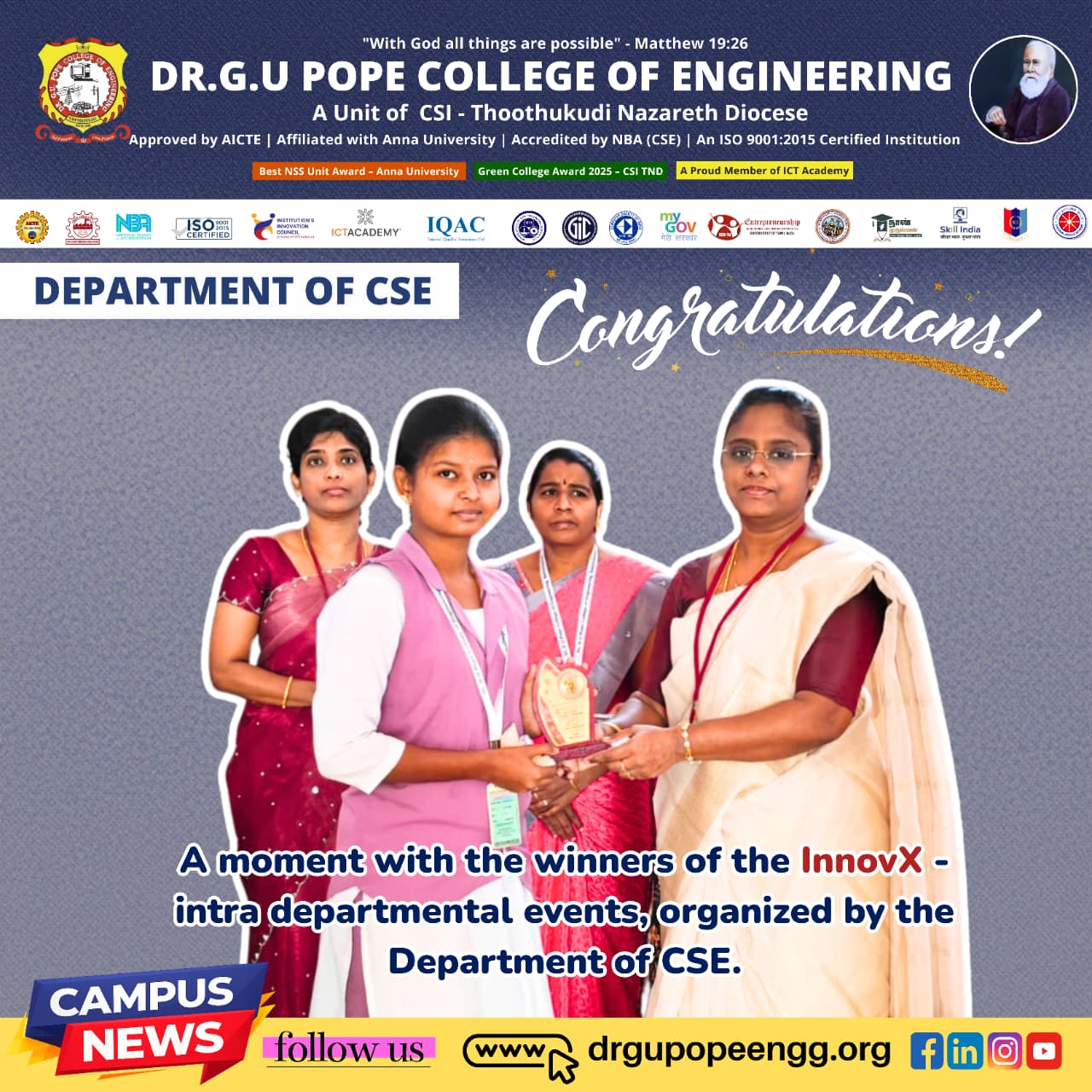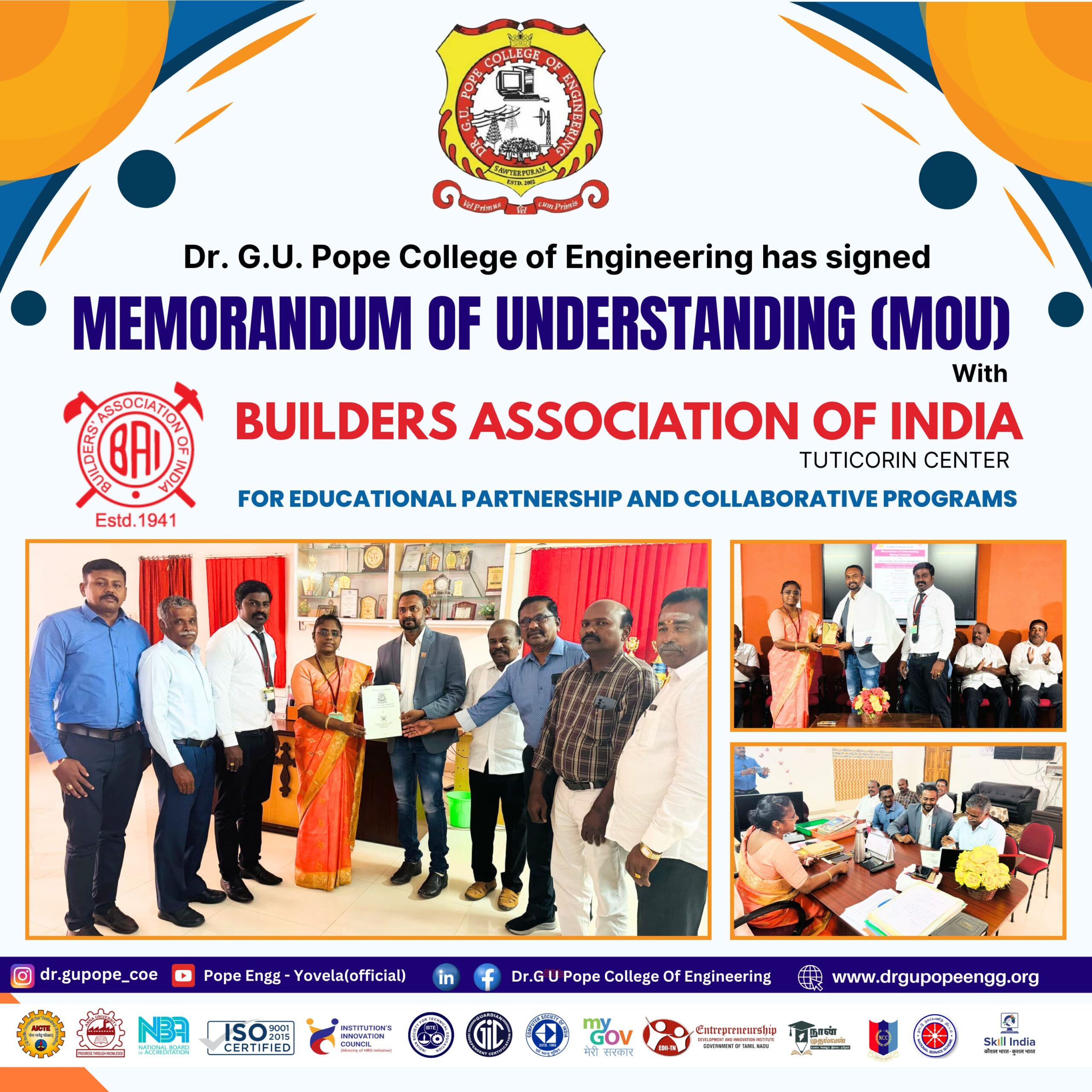 Dr. G.U. Pope College of Engineering stands as the fulfillment of the earnest aspirations of Sawyerpuram’s well-wishers, who longed for the accessibility of technical education in their vicinity. Commencing its service to the Sawyerpuram community in the academic year 2002-2003, the college operates under the auspices of the CSI Thoothukudi-Nazareth Diocese. This institution was established by devoted and sincere missionaries committed to delivering quality and disciplined education to remote areas.