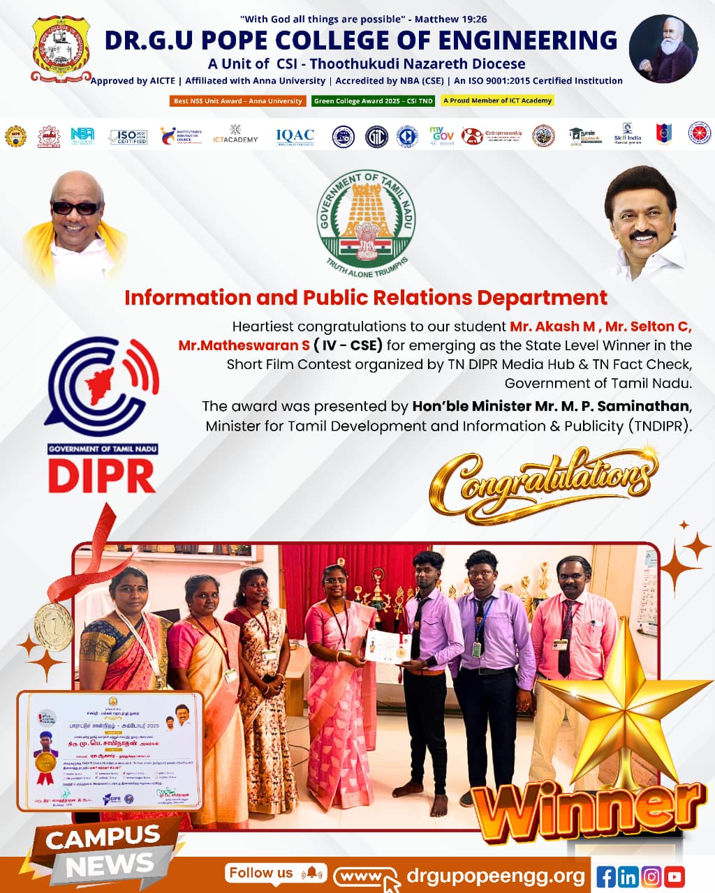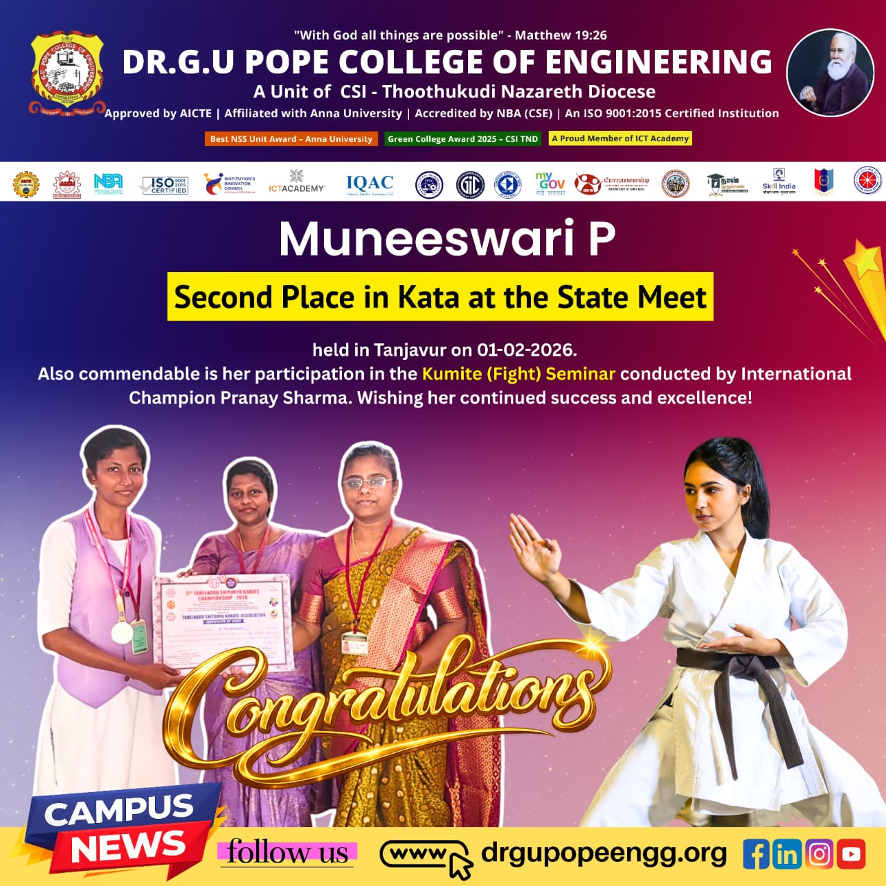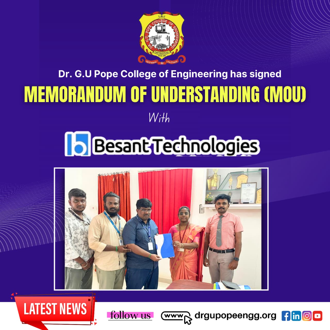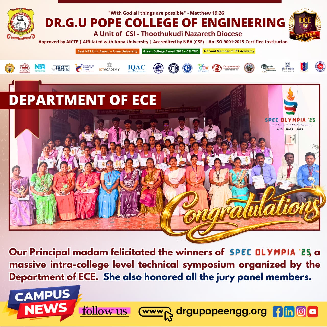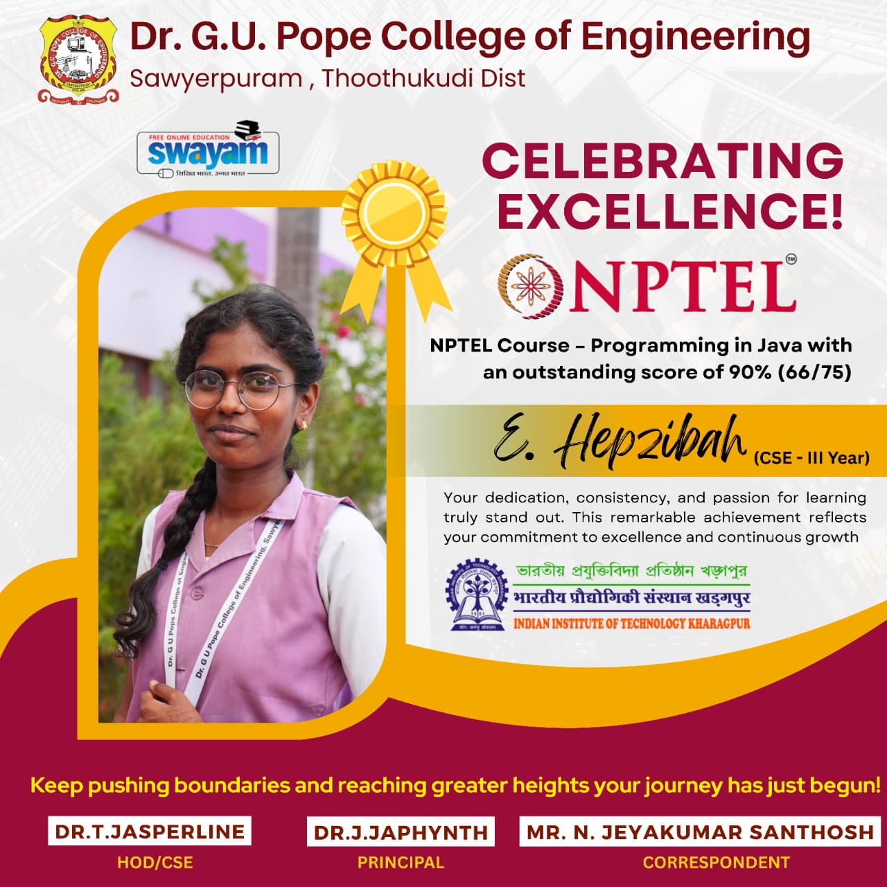 Dr. G.U. Pope College of Engineering stands as the fulfillment of the earnest aspirations of Sawyerpuram’s well-wishers, who longed for the accessibility of technical education in their vicinity. Commencing its service to the Sawyerpuram community in the academic year 2002-2003, the college operates under the auspices of the CSI Thoothukudi-Nazareth Diocese. This institution was established by devoted and sincere missionaries committed to delivering quality and disciplined education to remote areas.