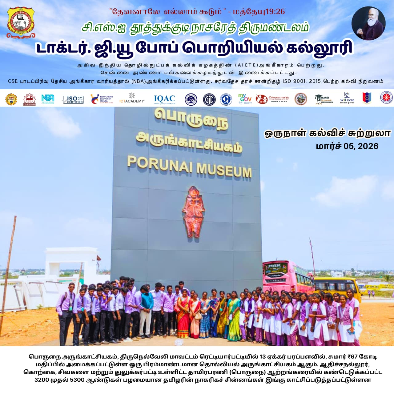 Nestled in a picturesque location amidst natural beauty, the college is situated on the Thoothukudi-Sawyerpuram ‘Theri Road, providing an ideal setting for academic pursuits.