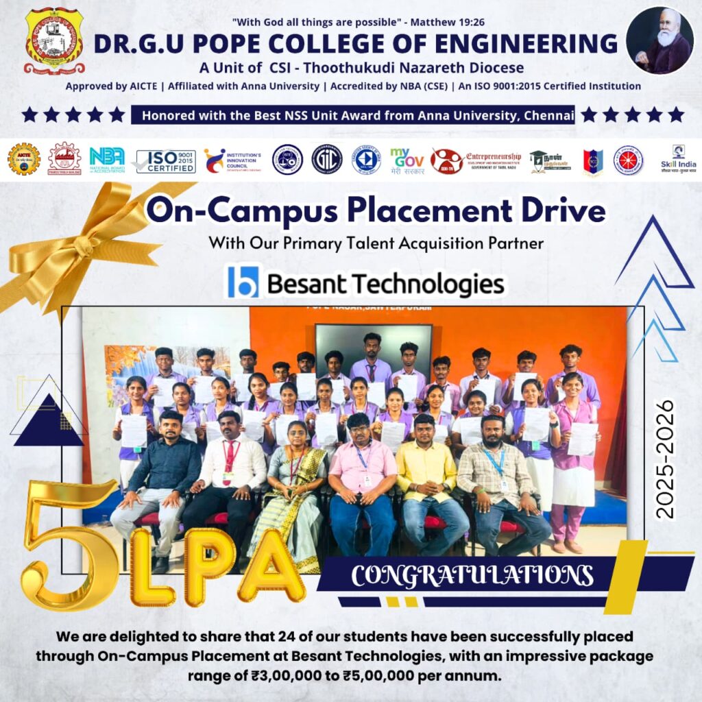 Thoothukudi, Oct. 25 — In a remarkable achievement, 24 students from the college have been successfully placed at Besant Technologies through the On-Campus Placement Drive.