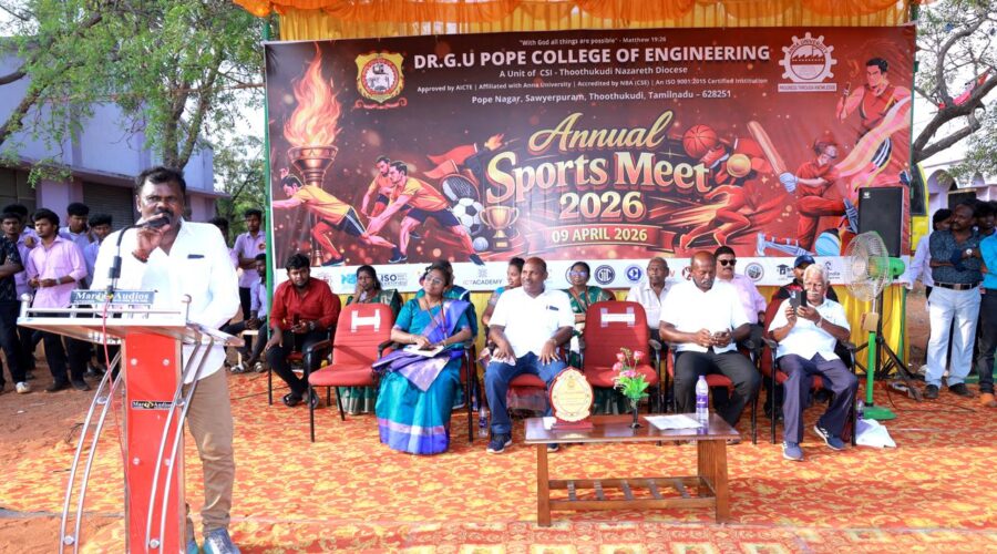Thoothukudi, April 9:The Annual Sports Meet 2026 of Dr. G.U. Pope College of Engineering was held with great enthusiasm at the college playground on Thursday. Mr. Manathi P. Ganesan, former Indian Kabaddi player, Olympic Games gold medallist, and Arjuna Awardee, attended as the Chief Guest and encouraged students to actively participate in sports for physical fitness and discipline. Mr. S.D.K. Rajan, Lay Secretary of CSI–TND, and Rev. P. Moses Jebaraj,...Read More