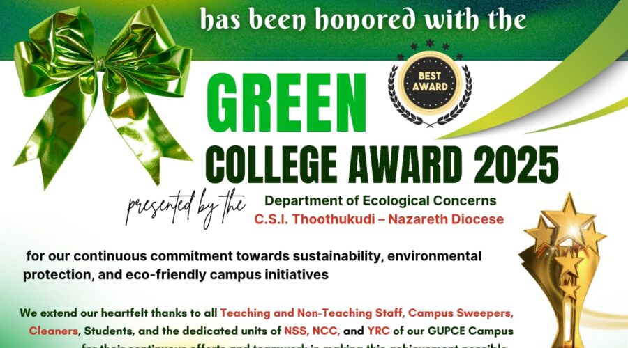 Sawyerpuram, October 30 — Dr. G. U. Pope College of Engineering, Sawyerpuram, has been conferred with the Green College Award 2025 by the Department of Ecological Concerns, C.S.I. Thoothukudi–Nazareth Diocese, in recognition of its consistent efforts towards maintaining an eco-friendly and sustainable campus environment. The award highlights the institution’s initiatives in promoting cleanliness, greenery, and environmental awareness among students and staff. The college administration expressed its heartfelt appreciation to all...Read More