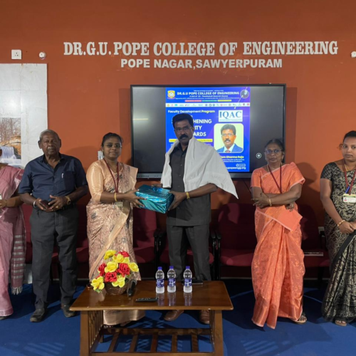 Thoothukudi, Feb 18, 2026:The Internal Quality Assurance Cell (IQAC) of Dr. G. U. Pope College of Engineering, Thoothukudi, organized a Faculty Development Program (FDP) titled “Strengthening Quality Standards” on Tuesday, 18 February 2026, at the Conclave Hall, Admin Block. The programme was conducted exclusively for the internal faculty members of the institution. The session was led...Read More