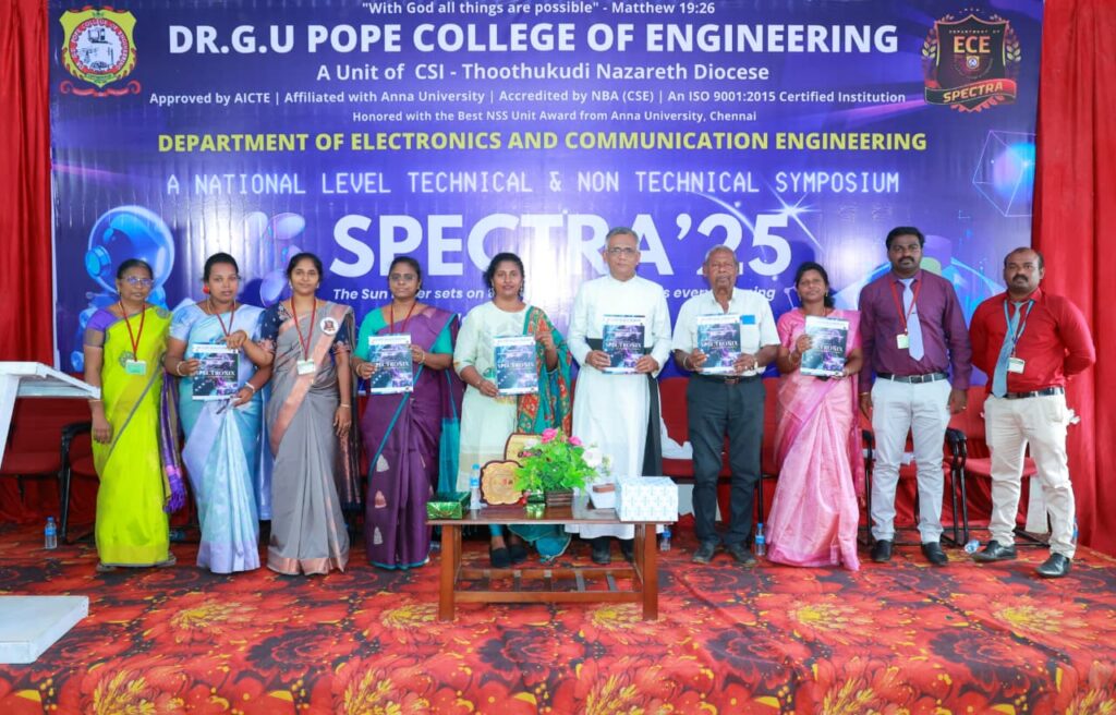 The Department of Electronics and Communication Engineering of Dr. G. U. Pope College of Engineering, Sawyerpuram, organized a National Level Symposium titled Spectra’25 on 17th September 2025 at the college auditorium.