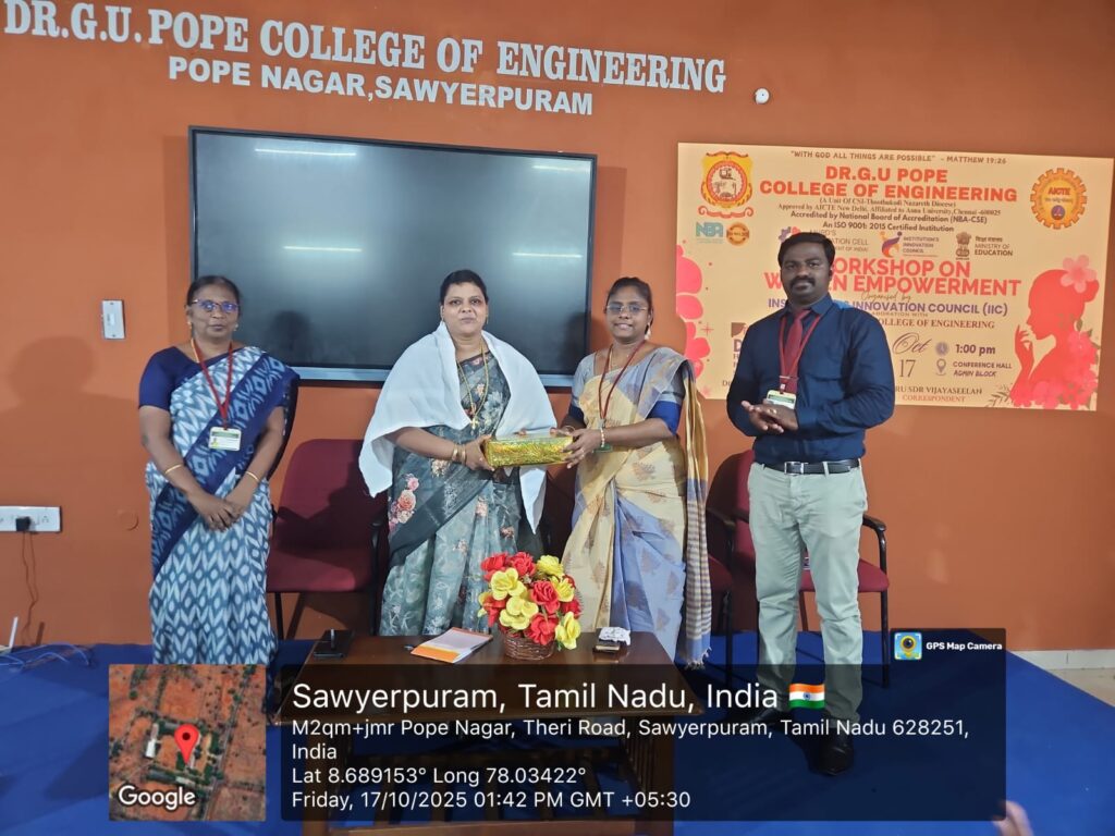 Thoothukudi, October 17: The Institution’s Innovation Council (IIC) of Dr. G.U. Pope College of Engineering, in collaboration with IQAC, organized a Workshop on Women Empowerment at the college campus on Friday.